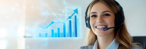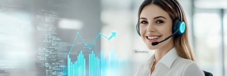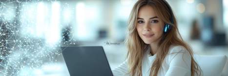 Eine junge Frau arbeitet konzentriert an einem modernen Service Desk, ausgestattet mit Headset und Computer.